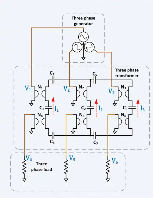 N1, N2, and N3 are the number of turns in the three primary windings. N4, N5, and N6 are the number of turns in the three secondary windings. Φ1, Φ2, and Φ3 are the fluxes in the three vertical elements. Magnetic flux in each permeance element in webers is numerically equal to the charge in the associated capacitance in coulombs. The energy in each permeance element is the same as the energy in the associated capacitor.