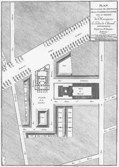 Around 1780, disgraced and in financial difficulty, Choiseul decided with the help of his banker friend, Jean-Joseph de Laborde, to subdivide his property for development. The garden, reaching the boulevard to the north and bordered on the south by the hôtel of the Duchess of Gramont Béatrix de Choiseul-Stainville, became the site of the Opéra-Comique's first Salle Favart, which opened in 1783.[13]