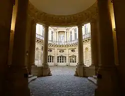 The building contains several unexpected elements for an hôtel particulier. Public shops are located along the ground level, which may be a continuation of an ancient Roman tradition. The mezzanine windows, which were uncommon in Paris, may have been a throwback to High Renaissance in Rome.[6] In the plan, there are different paths for circulation for servants and noblemen. Many unusual details of the plan: the corps de logis placed along the street with the cour d’honneur behind, the circular vestibule, the angled passage from the court to the rue de Jouy, the semicircular ending of the court, and the stair at the left rear of the court, were the result of Le Pautre's use of the foundations of the three medieval houses that originally occupied the lot.[7]