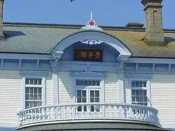 The Hōheikan is currently the only building used as a wedding hall among the Important Cultural Properties.[4] The building is also the oldest wooden hotel building in existence in Japan.[3] The architecture of the Hōheikan comprises a few styles. The whole building was constructed in the American style, but the balcony and its accompaniments at the front of the building was constructed in European style. The semicircle roof at the centre of the building has a Gegyo (懸魚) sculpture, a Japanese traditional fish sculpture usually seen at the roof of Japanese shrines and temples.[3] The colour Ultramarine blue, which was imported from Europe, is painted on the column and window frames.
