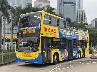 The Rickshaw Sightseeing Bus was introduced on 18 October 2009, intended to reminisce the early days of Hong Kong for visitors and local citizens, and also to facilitate the up-growing demand of individual travelers.[1] Before 13 December 2014, there were two routes which called "H1 Heritage Tour" and "H2 Metropolis Tour", but it merged into a route with the new crossing-harbour trip.