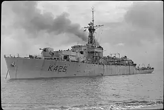 Commissioning in June 1944 with the pennant number K425,[12] the ship was allocated for service in the 10th Escort Group based on the Clyde.[10] In August she was attached to the 20th Escort Group to prepare for Russian convoy duty,[12] but on 12 August 1944[a] was in collision with the destroyer Bulldog.[10] While Loch Dunvegan was quickly repaired, Bulldog was more severely damaged, and did not return to service until September that year.[10][13] On 15 August Loch Dunvegan left Loch Ewe as part of the close escort for Convoy JW 59 to Murmansk.[14] On 24 August Loch Dunvegan, together with the destroyer Keppel and the sloops Mermaid and Peacock took part in the sinking of the German submarine U-354.[15] The next day the convoy arrived at Kola Inlet and Loch Dunvegan was detached to prepare for the return convoy, and left the Kola Inlet on 28 August with Convoy RA 59A for the return journey.[10][15]