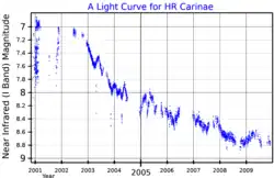 HR Carinae undergoes spectral variations apparently correlated with the light variations similarly to other luminous blue variables. It has undergone several outbursts during which the visual brightness increases and the temperature drops, but the bolometric luminosity remains approximately constant. The visual brightness increased erratically but consistently during the later decades of the 20th century to a record peak of mag 6.8, then dropped straight to a record minimum of mag 8.8 by 2010.[8]