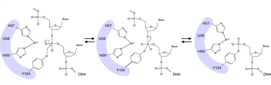 HUH endonucleases generally have two histidine (H) residues in the active site coordinating a metal cation (Mg2+ or Mn2+) that interacts with the phosphate backbone of DNA. These residues allow for a nucleophilic attack, most commonly by an activated tyrosine of the scissile phosphate in the DNA backbone, generating a 5' covalent bond with the ssDNA. In contrast to other DNA-protein linkage approaches, this reaction occurs at ambient conditions and does not require any additional modifications. X-ray crystallography and NMR structures have provided insight into the sequence specificity of DNA binding.[4][5]