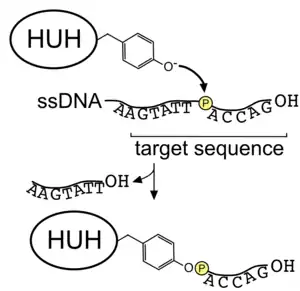 HUH endonucleases (HUH-tags) are sequence-specific single-stranded DNA (ssDNA) binding proteins originating from numerous species of bacteria and viruses.[1] Viral HUH endonucleases are involved in initiating rolling circle replication while ones of bacterial origin initiate bacterial conjugation. In biotechnology, they can be used to create protein-DNA linkages,[2] akin to other methods such as SNAP-tag. In doing so, they create a 5' covalent bond between the ssDNA and the protein. HUH endonucleases can be fused with other proteins or used as protein tags.