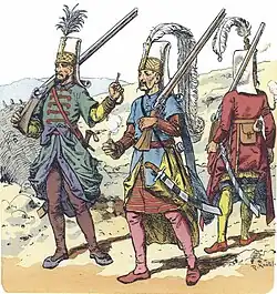 The fortress was defended by 2,100-2,300 people,[3] a mixture of professional soldiers, peasants, and a few dozen women. The defenders were commanded by István Dobó and his deputy István Mekcsey, who had assumed command in 1549. Among the approximately 1,530 combat-ready personnel there were only a handful of foreign mercenaries:[3] Dobó had hired six cannonmasters from Germany in order to make the most efficient use of Eger's artillery. Another noted officer, famous in Hungarian literature and folklore, was Gergely Bornemissza. He commanded a detachment of 250 Hungarian infantry; however, it was his skill with explosives that was to make this young officer's name. During the siege, Bornemissza devised primitive but lethal grenades and powderkeg-sized bombs to use against the attackers as well as a water-mill wheel packed with gunpowder which he rolled into the Ottoman ranks. His secret lay in the gunpowder not simply exploding but sparking even more fire. He loaded these weapons with oil, sulfur, and flint in order to shower the enemy with burning missiles.[4]