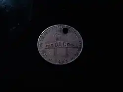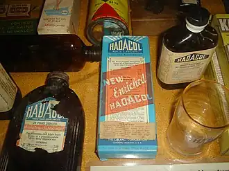 LeBlanc flooded the airwaves with testimonials to the powers of the seemingly miraculous (yet foul tasting) brown liquid and turned the jingle called "Hadacol Boogie" into a popular recording. Promotional items included various fliers, signs and clocks, a "Captain Hadacol" comic book,[8] T-shirts, lipstick, an almanac, plastic thimbles printed with the Hadacol logo, water pistols and cowboy-style holsters, glasses used for taking the diluted mixture, and a stamped metal token redeemable for 25¢ towards the purchase of any bottle of Hadacol (LeBlanc placed his own portrait on the front of the token, and the trademarked logo on the back).[9] These items, along with the Hadacol bottles and the boxes they were packaged in, are now sought-after items and fetch high prices among collectors of Southern memorabilia and medical quackery.