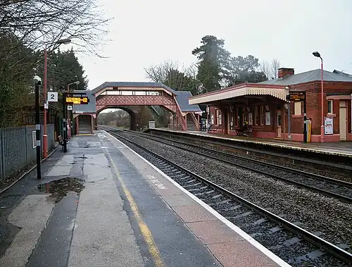The station retains one of its Great Western Railway era station buildings and its canopied footbridge, both dating from 1884. Although typical of its era, very few examples of that kind of ornamental ironwork bridge now survive and it was listed grade 2 in 2000.[2] When it was refurbished in late 2011, the colours reverted from its former navy blue and white to the original GWR cream and salmon livery.[3] The footbridge was also used by Hornby as the basis for its 00 Gauge model.[4]