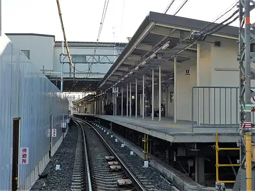 The station was elevated in stages: a temporary station opened on 20 May 2013, the new elevated outbound platform for the mainline opened on 14 May 2016, the inbound platform for the mainline followed on 22 May 2021, and the elevated station was completed with the opening of the Takashinohama Line platform on 6 April 2024.