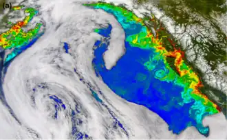 The southeast and central Gulf of Alaska tends to be iron-limited, and Haida eddies deliver large quantities of iron-rich coastal waters into these regions.[15][16] In High-Nutrient, Low-Chlorophyll (HNLC) areas, iron tends to limit phytoplankton growth more than macronutrients, so the delivery of iron plays an important role in stimulating biological activity. While surface waters within the eddy are similar to that of ambient HNLC waters, waters in the eddy core are highly iron-enriched. Iron is delivered upward to the surface from the eddy core as a result of physical transport properties as the eddy decays or interacts with other eddies.[17] This iron flux into the photic zone (where light is abundant to support growth), is associated with an increase in spring and summer primary production, and drawdown of macronutrients as they are consumed by phytoplankton.[14] Increased iron concentrations have been observed to persist in the core of the eddy up to 16 months after eddy formation.[16] Physical transport properties retain a supply of iron to the surface from the still iron-rich eddy core for the lifetime of the eddy. Because of the large vertical iron transport, Haida eddies contribute a significant portion of the total iron available for biological use.[18]