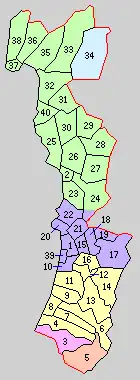 * yellow - areas formerly within the district borders during the early Meiji period