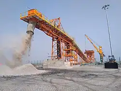 The floating cargo handling terminal has infrastructure to handle barges and mini bulk carriers (MBC), and its jetty is capable of handling 10,000-12,000 DWT vessels.[60][61][62] The terminal's jetty has a 66 metres (217 ft) long berth, with 3 mooring dolphins, and two reinforced cement concrete (RCC) decks known as crane deck and hopper deck. The crane deck contains a Liebherr CBG 300 crane,[63] and the hopper deck mounted with a hopper that is connected to the conveyor belt. Cargoes transported by barges and mini bulk carriers (MBC) from Sandheads and Sagar anchorages are unloaded at this terminal, which is transloading from larger vessels to barges and mini bulk carriers (MBC) by floating crane facilities. For discharge of cargoes, mainly coal, has a crane on the fixed RCC jetty, which transfers the cargoes from the moored barge or mini bulk ship to the hopper. The terminal's jetty has a minimum water depth of 8 metres (26 ft), which can easily handle mini bulk ships.[61] The terminal is capable of handling 4 million tonnes of cargoes annually.[61]