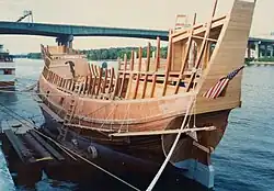 Half Moon is a replica of Halve Maen, the famed ship that English mariner Henry Hudson sailed up the Hudson River in 1609. The ship was constructed between 1988 and 1989 at the Snow Dock in Albany, New York, its construction commissioned by Dr. Andrew Hendricks.[1] The ship's construction fulfilled Dr. Hendricks' dream to use the historic icon as an educational instrument, bridging the gap between the American way of life and the Dutch heritage in New York state. In March 2015, the replica ship departed the Hudson River Valley to a new home, Hoorn, The Netherlands.[2] In February 2019, it was announced that the Hoorn government would not extend their contract to serve as the Dutch homeport of the Half Moon. Hoorn's contract expired on April 1, 2020.[3] The Half Moon is currently at port in Kampen, Netherlands. The board of directors of the New Netherland Museum have not announced what the future of the ship may hold.[4]