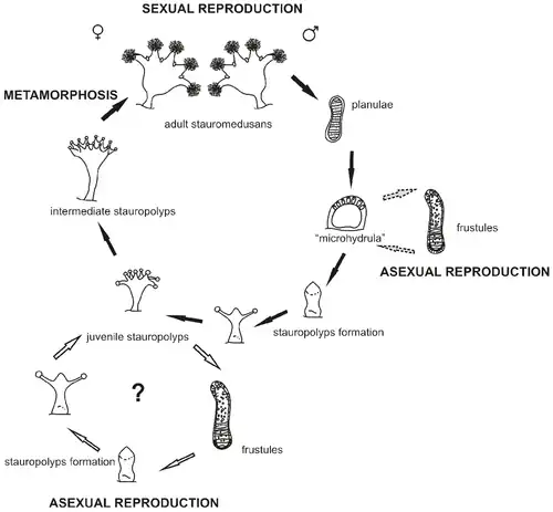 A recent genetic analysis has suggested that Microhydrula limopsicola, originally classified as a member of the order Limnomedusae, is in fact a developmental stage of Haliclystus antarcticus.[1] In its mature form H. antarcticus has eight gonads which are organised into four pairs and run from the central mouth to the ends of the arms. The gonads are approximately 1.6–12.9 mm in length and are visible through the wall of the calyx. The gonads are mature in specimens which have a calyx height of about 11.72 mm and greater.[2]