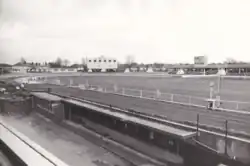 In the late 1920s a 440-yard circumference track was a decent size circuit with long straights and fairly easy turns. Handicaps and an 'Inside Sumner' hare were features of the track and the main distances were 500 and 700 yards. Facilities at the time included the main stand which offered the Hall Green Sports Club and Enclosure Club with stands on the opposite side of the track to accommodate the large patronage. A small annual subscription allowed patron's admittance to the clubs and it was not long before a restaurant service was introduced. Similar to other larger tracks of the time there was a resting kennel located away from the track and the Hall Green resting kennels were found nearby at Bogay Hall Farm in Solihull.[8] The stadium hosted speedway races between 1928 and 1938, with a team called the Birmingham Bulldogs racing out of the stadium.[13]