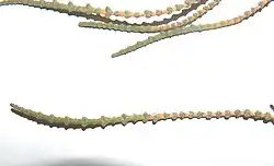 The genus Halocnemum was first published in 1819 by Friedrich August Marschall von Bieberstein,[3] at that time comprising two species, Halocnemum strobilaceum and Halocnemum caspicum (the latter is now a synonym of Halostachys belangeriana). Halocnemum strobilaceum was selected as the type species.[4] During the 19th century further species were added, later these were grouped into other genera or treated just as synonyms of Halocnemum strobilaceum. For many years the genus Halocnemum has been regarded as monotypic. In 2008, the new species Halocnemum yurdakulolii was discovered,[5] although some treat it as a synonym of Halocnemum cruciatum in 2012.[6]