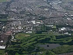 ![]() 2018 aerial view of Hamilton West, including council headquarters, courthouse, racecourse, university, football stadium and retail park | |