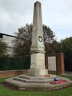 The Hampstead War Memorial is located in front of Heath House opposite Jack Straw's Castle, on the northern fringes of Hampstead Heath in London where North End Way, Heath Street and Spaniards Road meet. The memorial marks the deaths of local individuals who died fighting in the First World War and the Second World War. It was dedicated on 4 May 1922 by the Bishop of Willesden, William Perrin, in a ceremony attended by Major General Sir Charles Vere Ferrers Townshend. The memorial is a tall thin stone obelisk on a square plinth with a three-step base.[1]
