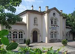 The entrance building is one of the oldest surviving in Hesse. It was put into operation on 10 September 1848. It was designed by Julius Eugen Ruhl.[5] He placed it directly at the intersection of Hochstädter Landstraße with the Burgallee, the connection between the Park Wilhelmsbad and the Baroque palace of Schloss Philippsruhe, which was the residence of the Count of Hanau when the station was established. The station building was therefore equipped with a Fürstenzimmer (prince's room), which occupied the central part on the ground floor of the entrance building, as a waiting area for the "highest and most supreme rulers".[6] In the 1990s, the building was privatised and has since been used for a restaurant. The entrance building is listed as a cultural monument under the Hessian monument protection law. Today it is included with the architectural ensemble of the park of Wilhelmsbad.[7]