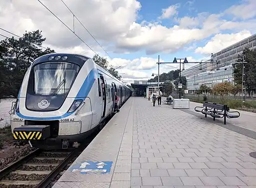 Handen is a station on Stockholm's commuter rail network, located 26 km from Stockholm Central Station on the Nynäs Line. The station consists of a single island platform with a ticket hall integrated into a pedestrian bridge connecting to a bus terminal. The station opened in its current location in 1973 and serves as a major transit hub for bus and rail traffic within Haninge Municipality. As of 2015, approximately 7,500 passengers boarded trains at Handen each weekday, while the entire terminal area saw about 13,400 daily boarding passengers.[2]