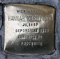 On December 9, 1942, Hannah Karminski - ill, with a high fever - was arrested and deported from Berlin to Auschwitz-Birkenau, with the 24th Osttransport, with over 1000 people.[7] There, she was murdered on June 4, 1943.[8]