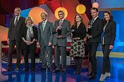 2013 award ceremony. L–R: Georg Mascolo, Ilse Friedrich, Tom Buhrow, Jörg Armbruster, Eva Müller, Marcel Mettelsiefen, Anne Will