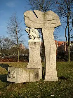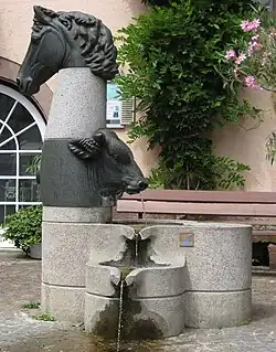 Since 1959 he had lived and worked in Karlsruhe. His most important works are the sculpture at the Elisabeth Selbert school in Karlsruhe and the Rappenbrunnen in Karlsruhe-Durlach.[3] The sculpture at the Elisabeth Selbert school has a height of 3.10m (10 feet 2 inches) and is made of granite with a marmor sculpture.[4] The Rappenbrunnen is also made of granite with a horse and bull head made of diabase which symbolize the names of the two crossing streets on which it has been erected.