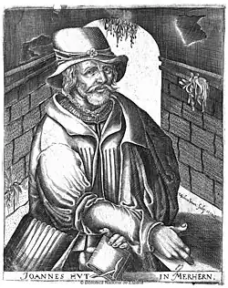 Hut was born in Haina near Römhild, in the Electorate of Saxony (now Thuringia), and became a travelling bookseller. Hut was for some years sacristan in Bibra to the knight Hans von Bibra (the brother of Bishop Lorenz von Bibra). He early came under the influence of Thomas Müntzer and, refusing to have his child baptized, was driven from the community in 1524.[1] He took part in the decisive battle of Thuringia during the German Peasants' War on 15 May 1525 at Bad Frankenhausen. About a week later at Bibra, Hut preached "subjects should murder all the authorities, for the opportune time has arrived." In his later years Hut distanced himself from Müntzer, saying that he (himself) "had clearly erred" and that he "had not understood him (Müntzer)."[2] After the battle he managed to flee and traveled throughout the region.