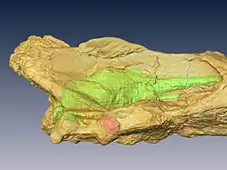 The braincase of 43-million-year-old Remingtonocetus, with brain (green) and ear (yellow and red) showing through, as based on high-resolution CT scan. The large green canal on the right carries the olfactory nerve and indicates that these whales had a developed sense of smell.