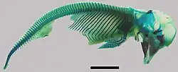 Fetus of dolphin showing similarities between land mammals and modern cetaceans. The pelvic remnant is seen as a small blue bar below the tail, and the many bones of the forelimb match those of land mammals. The large brains of cetaceans are growing and not protected by bone at this stage. The fetal tissues were made transparent, cartilage was stained blue, and bone purple. Scale bar is 1 cm.