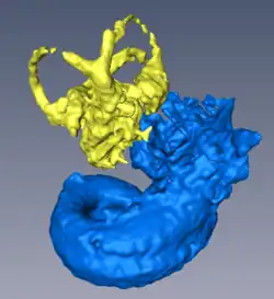 The organ of balance, yellow, and that of hearing, blue, in this 43-million-year-old Andrewsiphius