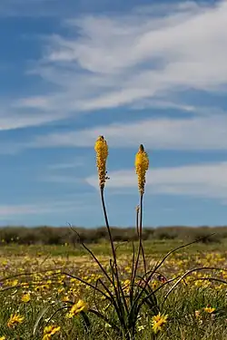 The winter rains on the Bokkeveld Plateau lead to massive blooms from August to the middle of October. 1,350 plant species are recorded here, including the Blue Pride-of-Nieuwoudtville . The garden has many bulbs and the geology includes formations in dolerite outcroppings.