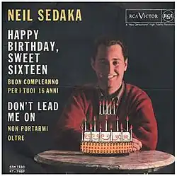"Happy Birthday Sweet Sixteen" is a pop song released in 1961 by Neil Sedaka. Sedaka wrote the music and performed the song, while the lyrics were written by Howard Greenfield. The song is noted for being similar in musical structure to Take Good Care of My Baby by Bobby Vee (another 1961 hit), and additionally for its resemblance to the melody of the Chiffons' subsequent 1963 hit "One Fine Day". Both of these songs exhibiting similarity to "Happy Birthday Sweet Sixteen" were penned by the team of Carole King and Gerry Goffin (King and Sedaka were close friends in high school, and Sedaka was known for his appropriation of other popular song motifs in his work). The song reached #6 on the Billboard Hot 100 chart[1] and No. 3 on the UK Singles Chart.