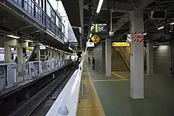 The station consists of a two side platforms serving two tracks.[13] The station was initially an island platform with an additional temporary platform for the Shinjuku direction during major events only. The temporary platform was made permanent during the 2020 renovations, and the two platforms now serve different directions.[1]