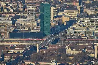 Since 1982, there is a railway station below the Hardbrücke, which is named Zürich Hardbrücke after the bridge. The station is located on the Zürich–Baden and Zürich–Winterthur (Käferberg Tunnel variant) lines.[6] It is served by regional trains (S-Bahn) of Zürich S-Bahn. The station is one of the busiest in the Zürich S-Bahn network. In terms of passenger numbers, it is ranked 11th in the country (as of 2018).[7] The station can be accessed either from the bridge or via an underpass. There are stairs and elevators in both cases.