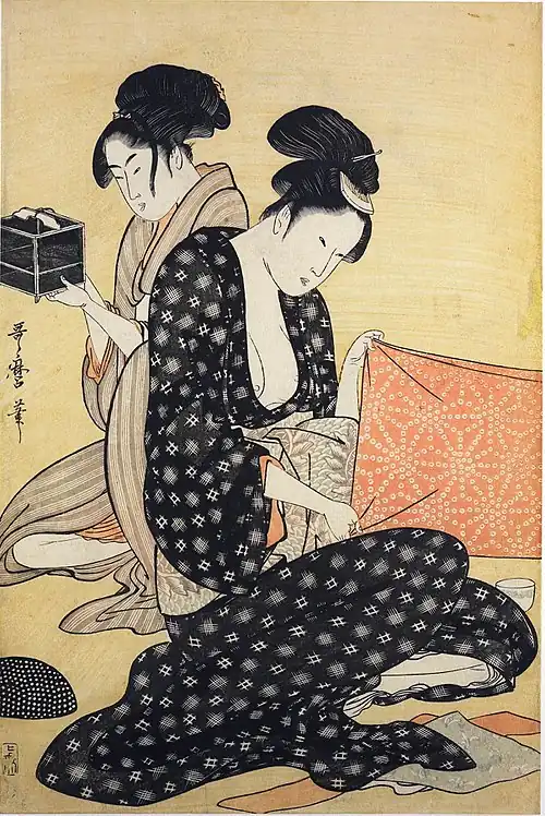 Kitagawa Utamaro (c. 1753–1806) made his name in the 1790s with his bijin ōkubi-e ("large-headed pictures of beautiful women") portraits, focusing on the head and upper torso, a style others had previously employed in portraits of kabuki actors.[4] Utamaro experimented with line, colour, and printing techniques to bring out subtle differences in the features, expressions, and backdrops of subjects from a wide variety of class and background.[5]