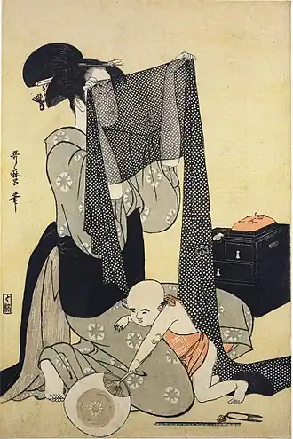 Hari-shigoto (針仕事, "Needlework", c. 1794–95) is a colour triptych print by the Japanese ukiyo-e artist Kitagawa Utamaro (c. 1753 – 1806). It depicts women working with cloth at home with children playing around them. Critics hold the prints in high regard, in particular the skill required to reproduce the translucent effect of the cloth with woodblock prints.