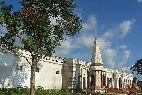 Haripur Barabari is a multi domed three stored building. Area and stylish architecture implies the historical craft, architecture and structural perfection. This palace boundary acquires nearly 5 acres of high land with 60 chambers including Theater, Darbar Hall, Store house, Cowsheds, Kitchen, Casino, Play ground, Pagoda, Temple, small pond etc. Six stare cases are at six side of the palace for first floor and two stare cases for second floor. Six bedrooms at the north-west, four at the east and four at the west side of the pond. There is a big brick build wharf(Bengali: সান বাঁধানো ঘাট) at the west of the palace that falls on the river and both sides decorated by pagodas of Krishna Prasad Roy Choudhury at the north and Gouri Prasad Roy at the south.[1][3][4] People of this area used river route for communication and comfortable journey and most probably wharf kept as the main gate for the same purpose.