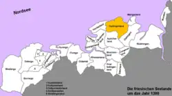 The Harlingerland is a strip of land on the North Sea coast of East Frisia. While today the whole of the district of Wittmund is usually described as Harlingerland, historically it specifically refers to the northern part of the present district, which formed the old Frisian state of this name, in particular, the regions around Esens and Wittmund. The region around Friedeburg still belonged at that time to the Frisian state of Östringen.