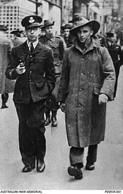 Australian War Artist Harold Freedman (left) in Collins Street Melbourne with his brother, c. 1943. Courtesy Australian War Memorial