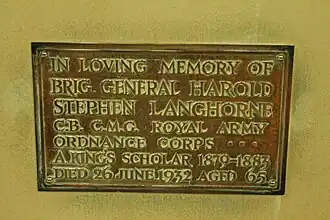 A brass plaque was put up in his memory at Rochester Cathedral. It reads: "In loving memory of Brig General Harold Stephen Langhorne CB CMG Royal army ordnance corps. A Kings scholar 1879-1883. Died 26 June 1932 aged 65".