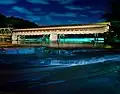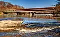 Harpersfield Bridge is a covered bridge spanning the Grand River in Harpersfield Township, Ashtabula County, Ohio, United States. * Currently disassembled for renovation 2023 * This double-span Howe truss bridge, one of currently 17 drivable covered bridges in the county, is the third longest covered bridge in Ohio at 228 feet. A flood in 1913 washed away the land at the north end of the bridge, and the steel span was subsequently attached. The bridge features a walkway, added during its renovation in 1991–1992. The bridge also features an Ashtabula County MetroPark at its north end and is listed on the National Register of Historic Places.[2][3] The bridge's WGCB number is 35-04-19,[4] and it is located approximately 3.4 miles (5.5 kilometres) south of Geneva.