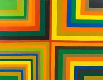 Critics such as Raphael Rubenstein describe an "emphatically handmade" geometry of wavering edges, tapering bands and irregularities in these works, which pulls what appears to be strict modular abstraction (e.g., Albers or early Stella) into the realm of Paul Klee and Mary Heilmann.[34] Other reviews attend to the improvisations, subtle shifts and unexpected jumps in this work—for example, variations between quadrants in the latter series, which disrupt the cruciform symmetry and resolution of the compositions as wholes; Roberta Smith wrote that the casually painted compositions "attest to the inexhaustibility of both color and geometry."[51][34][1][46]