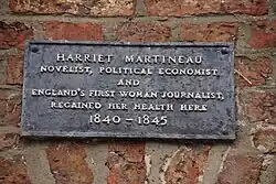 Martineau wrote a number of books during her illness, and a historical plaque marks this house. In 1841 she published a series of four novels for children, The Playfellow, comprising The Settlers at Home, The Peasant and the Prince, Feats on the Fiord, and The Crofton Boys. In 1844 she published Life in the Sickroom: Essays by an Invalid, an autobiographical reflection on invalidism.[46] In 1847 for John Saunders' The People's Journal she wrote a series of articles titled Homes for the People – Household Education.[47] The book Household Education was published in 1849 and updated by Martineau in 1870. The book highlighted the "subject so important" to her; "Life at Home", where "warm domestic affections" and "family happiness" should exist. She wrote that parents should be "wholly reliable" in order that they be "a joy to all hearts".[48] Lastly, she began working on her autobiography. Completed much later, it included some hundred pages on this period. Notable visitors included Richard Cobden and Thomas and Jane Carlyle.