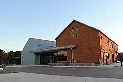 The visitor center and gardens were designed by GWWO, Inc., Architects, an architectural design firm based in Baltimore. Chris Elcock was the lead architect.[10] The buildings were located on the site and oriented to face north, the direction in which Tubman led slaves to freedom.[13] Plans called for four buildings, three dedicated to exhibits and one to house administrative offices. Each of the buildings is shaped like a barn, since Tubman and the slaves she was leading to freedom often slept in barns at night and barns are evocative of the rural architecture of the area. The three exhibit buildings are clad in a light green zinc siding which will dull with time. Zinc was chosen because it is a self-healing material which the architects felt reflected the healing which has gone on since the American Civil War. The administration building is clad in wood.[10] Construction of the buildings utilized a number of craftsman. Building materials included stone and reclaimed wood, and the architectural style featured exposed beams and timbers. The buildings were designed to have windows which featured views of the surrounding wildlife refuge, little of which had changed since Tubman's day.[13] All the structures were designed to be green buildings with at least a LEED Silver certification. The buildings feature geothermal heating and cooling, green roofs, permeable paving in parking areas and on pathways, and solar-powered external lighting.[13]