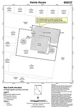 Harris House is set back from Clifford and Margaret streets, and surrounded by gardens on the east, north and northwest sides. The gardens contain a number of large, mature trees, open lawns and garden beds. The location of some early pathways has been retained, now formed by modern materials. The house's elevation above street level and corner location make it a prominent feature of the streetscape.[1]