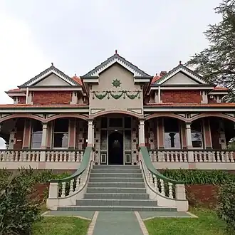 The single storey house is of red face brick construction with a tiled roof, central roof lantern, and wide verandahs around most of its perimeter. The front (east) elevation is the most ornate, with a tall entrance portico the dominant feature. Rectangular bay windows are symmetrically placed on either side of the main entrance door, which has a glazed surround. The red face brick contrasts with extensive concrete elements and ornamentation.[1]