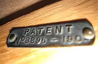 The drawers of Harris Lebus furniture such as chests, wardrobes and roll-top desks made during this period, can be identified by the H.L.L (stands for Harris Lebus, London) on the face plates of the brass locks. More obviously, some desks had 'The Lebus Desk' stamped on the escutcheon plate of the roll-top lock.[10][11][12] The Lebus drawer lock face plates during this period have characteristically rounded edges. This was a result of a 1904 patent designed to make the corresponding mortice more easily cut out by machinery.[13] Also in 1904, the firm took out a patent relating to the construction of drawer sides (a framed panel, rather than solid wood), to reduce warping and subsequent sticking.[14][15] This provides a further identification aid for Lebus furniture of the Edwardian period.[8]