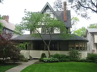 The Harrison P. Young House was first built during the 1870s for Harrison P. Young based upon a design by William E. Coman. In 1895 it was remodeled by famous American architect Frank Lloyd Wright for the same client.[5] The Young House is atypical to the other design work by Wright found in the neighborhood, though, its steeply pitched roof is closely identified with some of his other early work.[5][6] The Young House was perhaps most influenced by Wright's design for the Nathan G. Moore House, which was designed during the same period in a Tudor Revival style.[2] Wright's 1895 remodel was significant and included structural modifications; before any other work began the house was pushed back an additional 16 ft (4.88 m) from the street.[5]