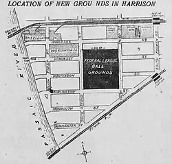The stadium had a seating capacity of around 21,000.[1] It was a large ballpark, with dimensions of 375 feet in left, 450 feet to center and 375 feet in right;[2] these dimensions, and the fact that baseball was still in its "dead ball" era, made it difficult to hit for power. Just six home runs were hit in Federal League play in Harrison, and only one left the ballpark, hit by the Peps' Emil Huhn (his only career home run). Huhn would be better known as Fred Toney's catcher in the "double no-hit" game on May 2, 1917, where both Toney and Hippo Vaughn tossed no-hitters through nine innings. A crowd of 26,032 attended the opener on April 16, 1915;[3] subsequent crowds were in the 5,000-10,000 range.